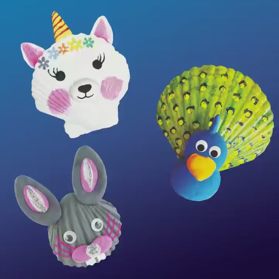 PecoToys proudly presents the Shell Painting Craft Kit ā the most unique & creative DIY art activity for kids aged 3 and above! Using 12 real seashells, 6 colorful paints & modeling clay, your child will transform ordinary seashells into adorable animal characters ā lion, cat, rabbit, unicorn, peacock & more!